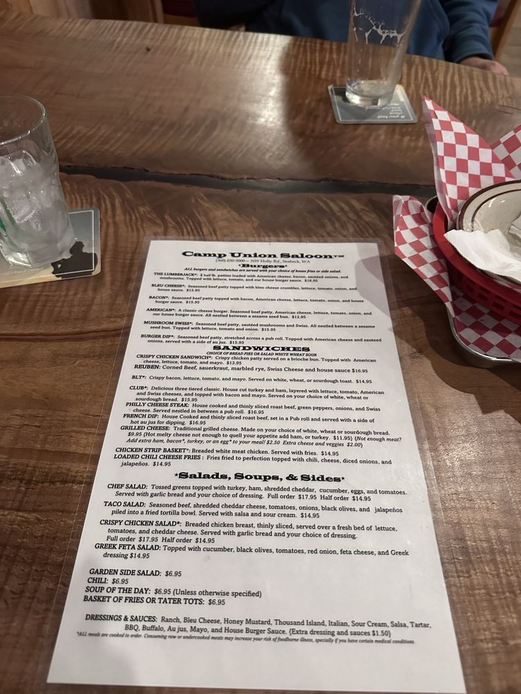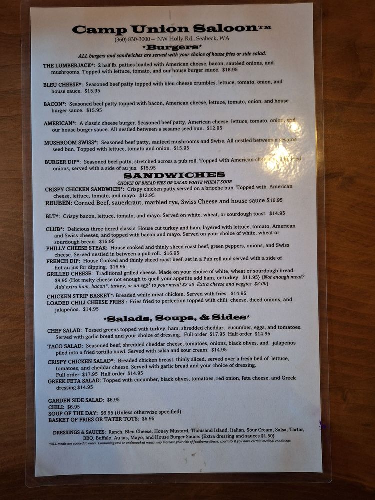 Welcome to Camp Union Saloon, a vibrant new hub in Seabeck, WA, where the charm of small-town atmosphere meets a modern take on American cuisine. The menu boasts an enticing array of options that cater to every craving, from hearty sandwiches like the Crispy Chicken Sandwich ($13.95) to the classic Reuben ($16.95). Don't miss their delightful shareables, such as Nachos ($17.95) and Beer-Battered Onion Rings ($11.95), perfect for enjoying with friends over drinks.